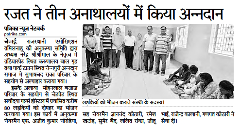 Rajasthani Association Tamilnadu organised Annadanam at orphanages