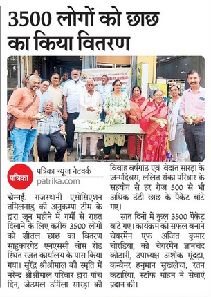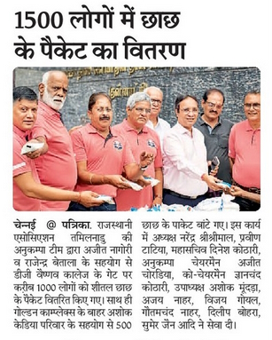 Rajasthani Association Tamil Nadu’s compassionate team, with the help of Ajit Nagori and Rajendra Betala, distributed cold buttermilk packets to about 1000 people at the gate of DG Vaishnav College Annadanam / By admin