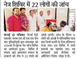 Chennai Metro Mahavir Club and Sri S S Jain Sangh Gummidipundi organised the 1236th free eye check-up camp on Tuesday Eye Camps / By admin