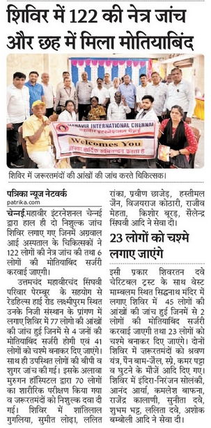 Mahavir International Chennai organized two free eye checkup camps in which doctors of Agarwal Eye Hospital conducted eye checkup of 122 people Eye Camps / By admin