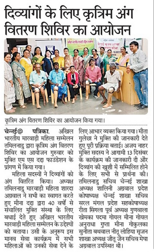 All India Marwari Mahila Sammelan Tamil Nadu organised an artificial limb distribution in the premises of Mukti MS Dadda Foundation. Health Camps / By admin