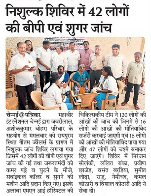 BP and sugar tests of 42 people were conducted in a free camp organized by Mahaveer International Chennai Health Camps / By admin