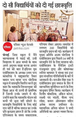Indian Youth Association distributed scholarships at Badal Chand Sayer Chand Chordia School / Educational, Scholarship / By admin