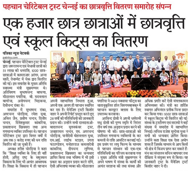 Scholarship distribution by Pehchaan Charitable Trust Chennai : 23-June’25